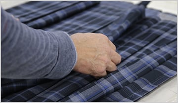 プリーツの形状によって、サイド・ボックス・アコーディオンなどの種類があります。加工方法として、型紙(カルトン)の間に生地を挟んで折り込み、セットするハンドプリーツ加工や、専用の機械でひだを折りながら熱ローラーでセットするマシンプリーツ加工などがあります。